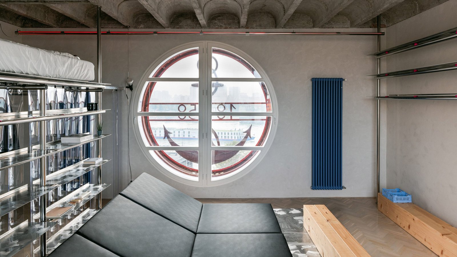 Los bloques de vidrio se alinean en la pared trasera de la ducha, con seis bloques azules en el centro que agregan colour a un esquema de diseño en escala de grises. El diseño neutro y utilitario del inside se creó para hacerlo adecuado a su propósito como espacio para artistas locales.