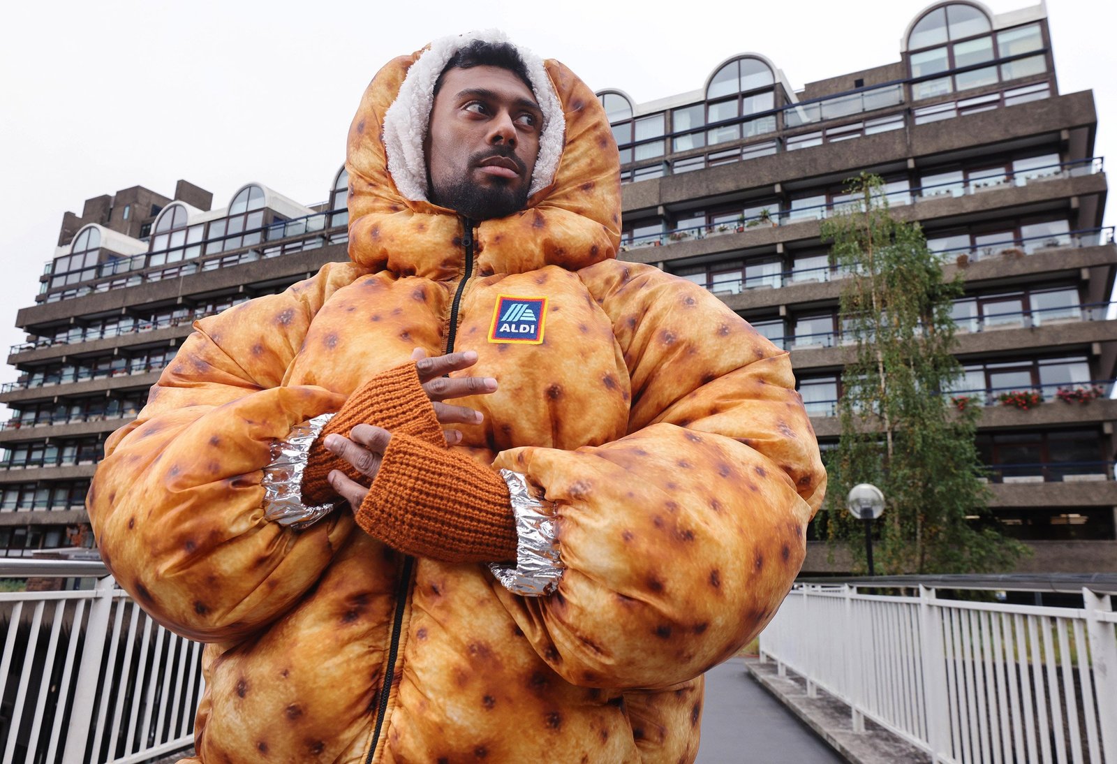 cadena de supermercados aldi se ha asociado con Londres moda marca Agro Studio para crear un abrigo acolchado que se asemeja a un gigante patata al horno.