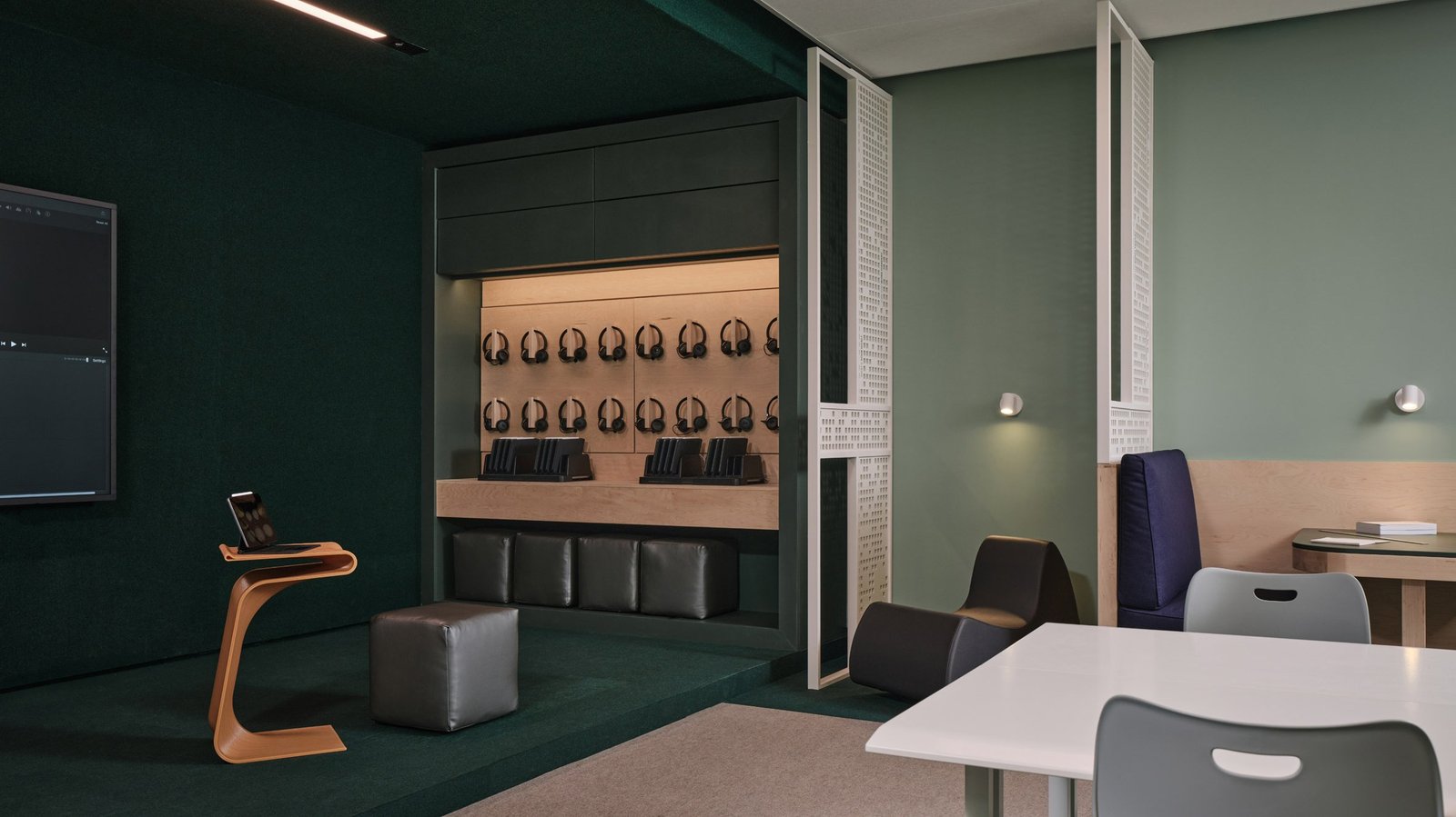 Una tranquila paleta de verde y azul decora el espacio y sus muebles, y las paredes están revestidas con una tela absorbente de sonido hecha 100 por ciento de poliéster reciclado.