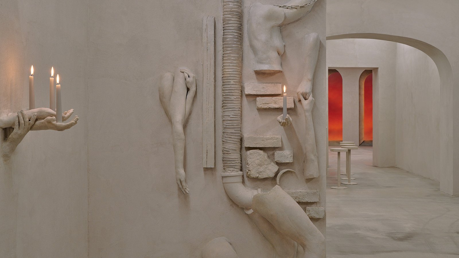 escultor británico Keith Roach y pintor británico Página Miró a la «Roma antigua y barroca» al decorar el inside con los peculiares relieves en yeso de Keith-Roach con forma de partes del cuerpo, que ofrecen una visión extraña de las esculturas tradicionales.