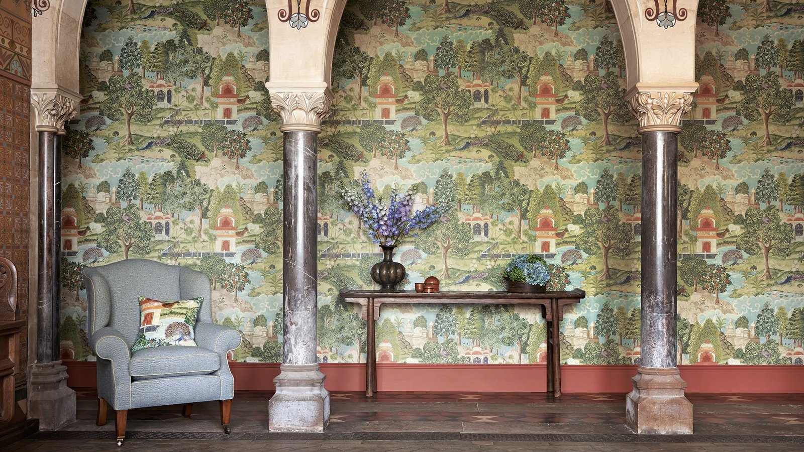 Se utilizó una combinación de métodos de impresión tradicionales y digitales para crear la colección, que cuenta con 16 telas y 13 papeles pintados.