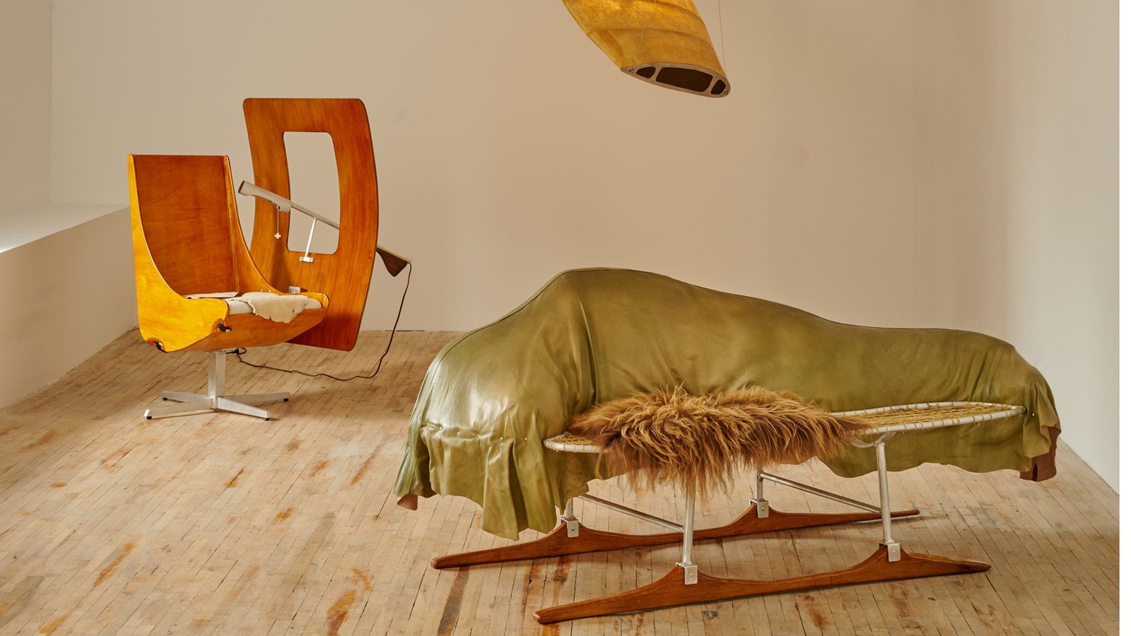 Otras piezas de la exposición incluyen una lámpara colgante con sombra de papel de arroz creada en forma de ala y una silla de aluminio y cuero en forma de vida.