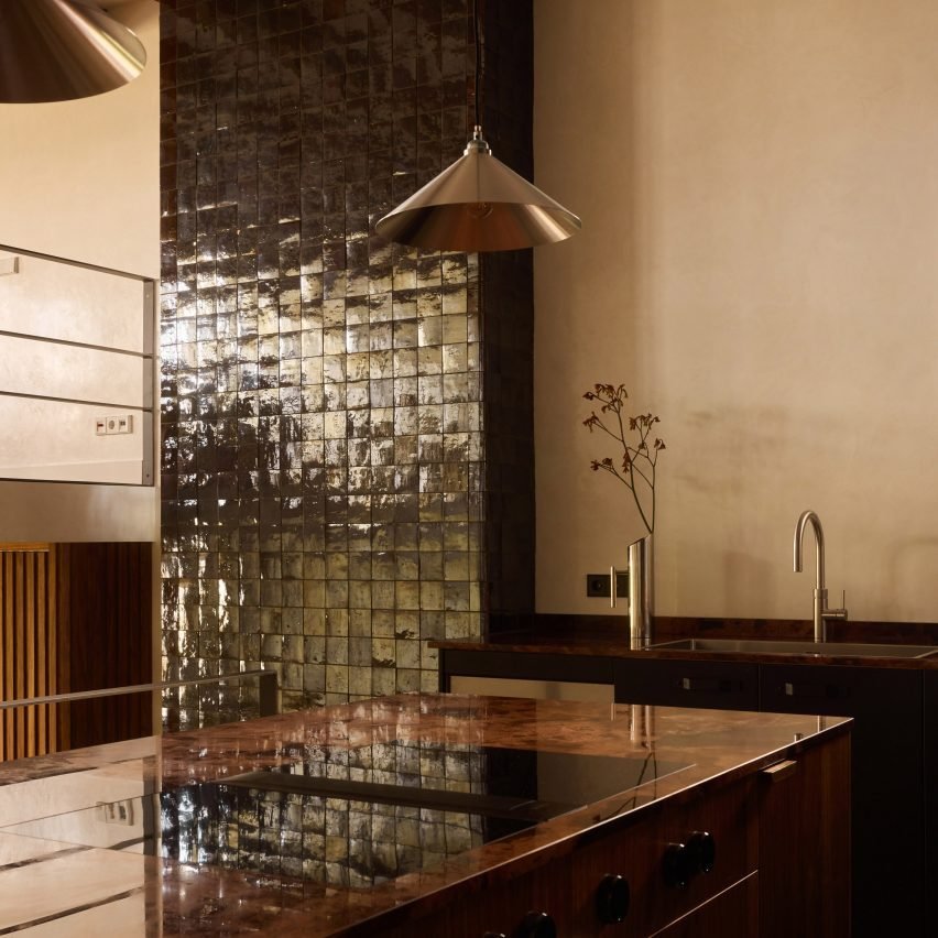 Las paredes del baño y la chimenea en el espacio liveable están vestidos de azulejos marroquíes Zellige con un glaseado marrón profundo con una calidad iridiscente que anima los espacios.