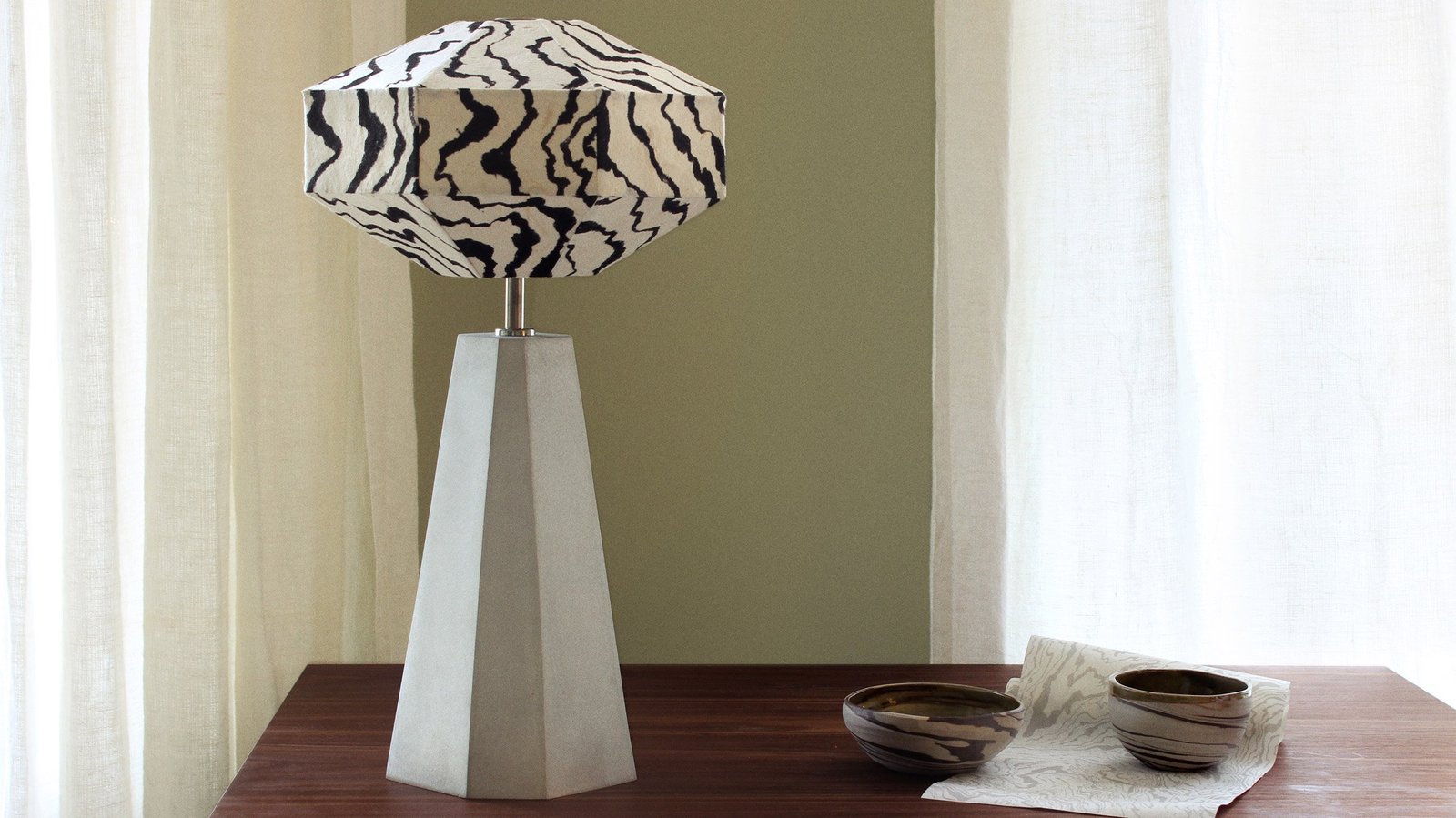 Informado por el tiempo de Henley que pasó viviendo en el sudeste asiático, la pieza está hecha de papel de mulberry translúcido hecha a mano por fabricantes de paraguas tradicionales cerca de Chiang Mai, Tailandia, que el diseñador pintó con tinta y equipado en un marco de bambú.