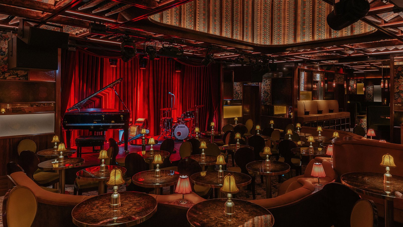Esta intimidad se logró a través de un plano de planta reelaborado. Se dispusieron asientos de cabaret sutilmente escalonados alrededor del escenario central, que está enmarcado por lujosas cortinas de terciopelo rojo y alberga un llamativo piano de cola.