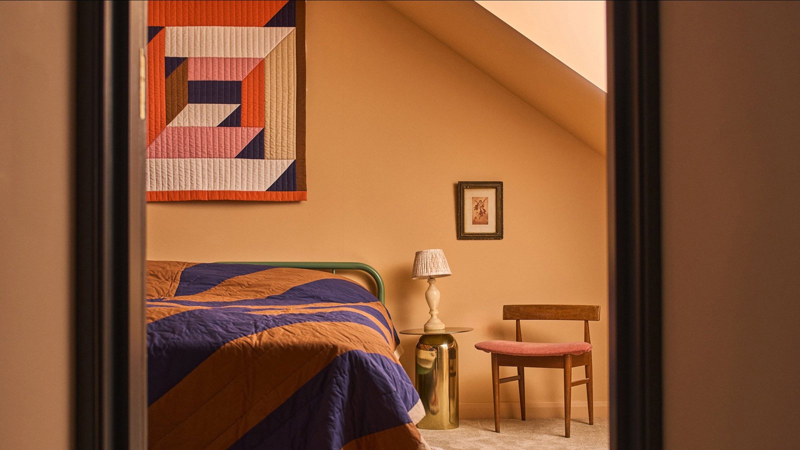 Estudio textil Granito y humo Se hizo cargo del dormitorio del ático, creando una sensación geométrica fuerte con las alfombras infinitas, las formas de la pared y la colcha de management grande.