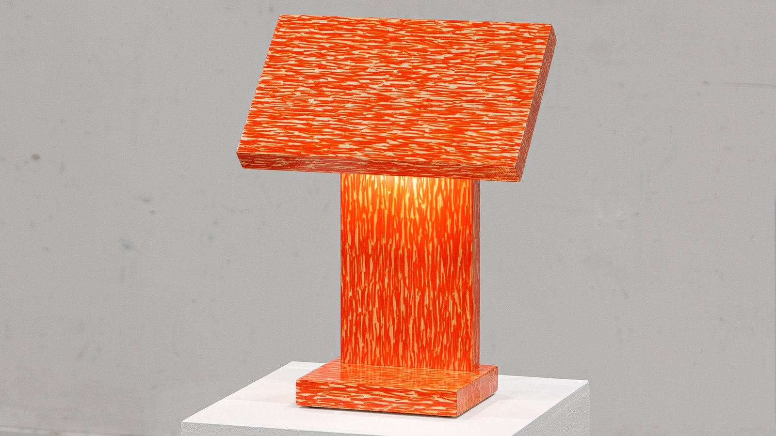 Las vibrantes líneas naranjas de la lámpara confieren a los objetos más pequeños una presencia audaz y producen un brillo cálido cuando se enciende la luz.