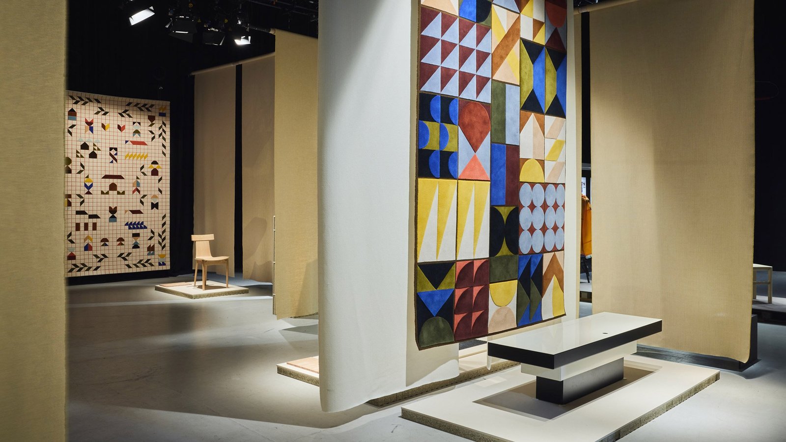 Por ejemplo, los podios fueron despliegos de bajo grado de los almacenes, y los divisores de la habitación fueron Cuadrado Los textiles se mantienen en los rollos para que puedan ser enrollados y vendidos ahora que la exposición ha terminado.