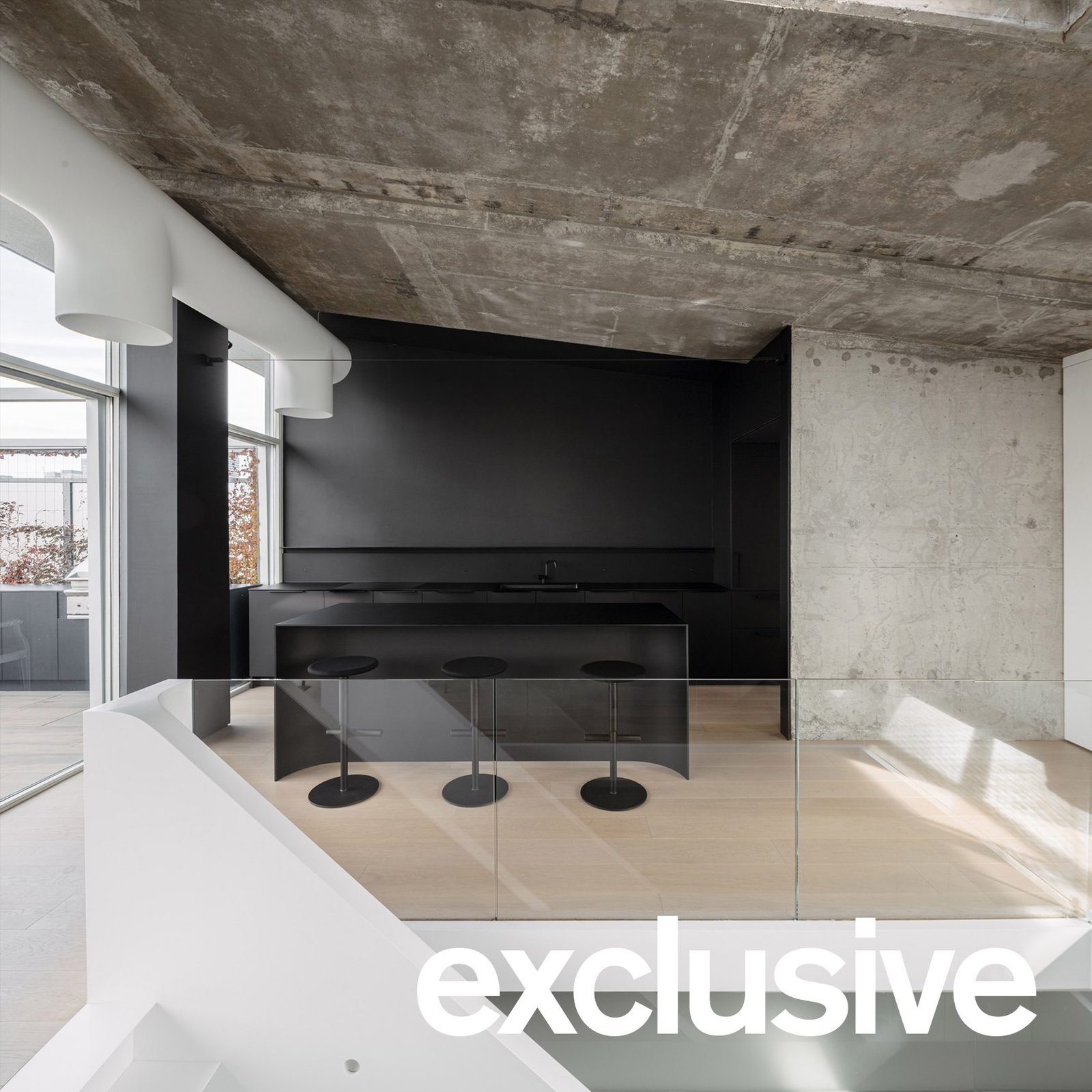 Una cocina completamente negra se destaca sobre el inside blanco y de hormigón de este minimalista toronto áticodiseñado por el estudio canadiense GH3*.
