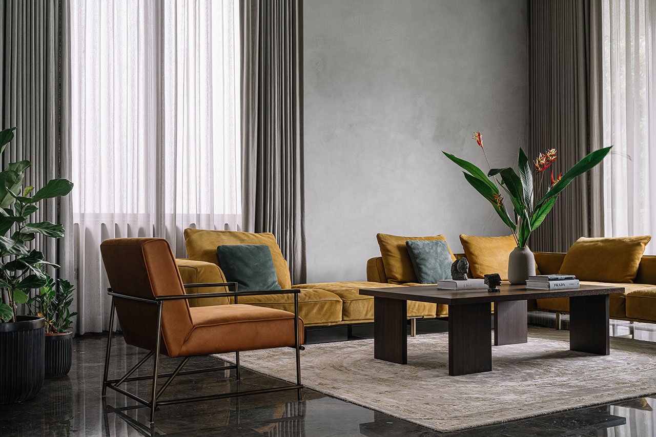 Salón moderno con asientos de color amarillo mostaza y naranja, mesa de centro de cristal, grandes ventanales, paredes grises, cortinas transparentes y plantas en macetas.