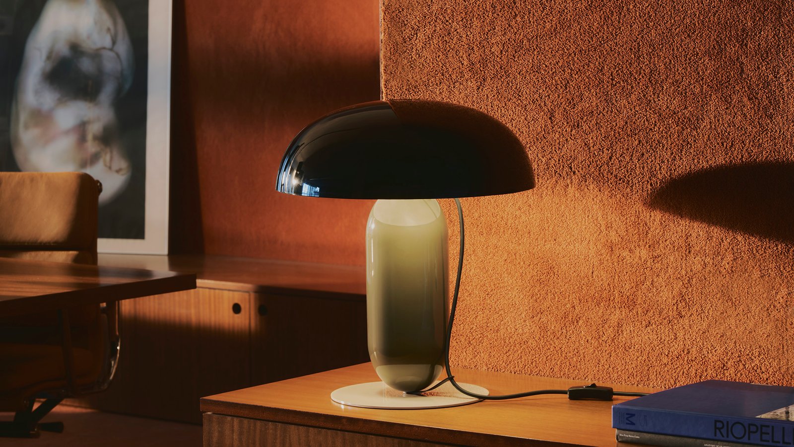 La lámpara de mesa Gambosa está disponible en una paleta selecta de colores combinables, con un tallo naranja o gris musgo y una pantalla negra, rosa u ópalo.