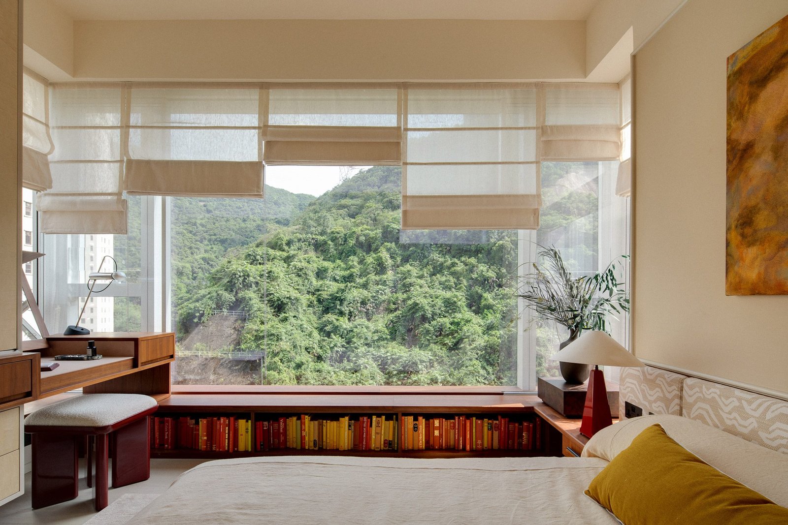 En la habitación principal, una estantería baja hecha de chapa de nogal corre a lo largo de una ventana de imagen.