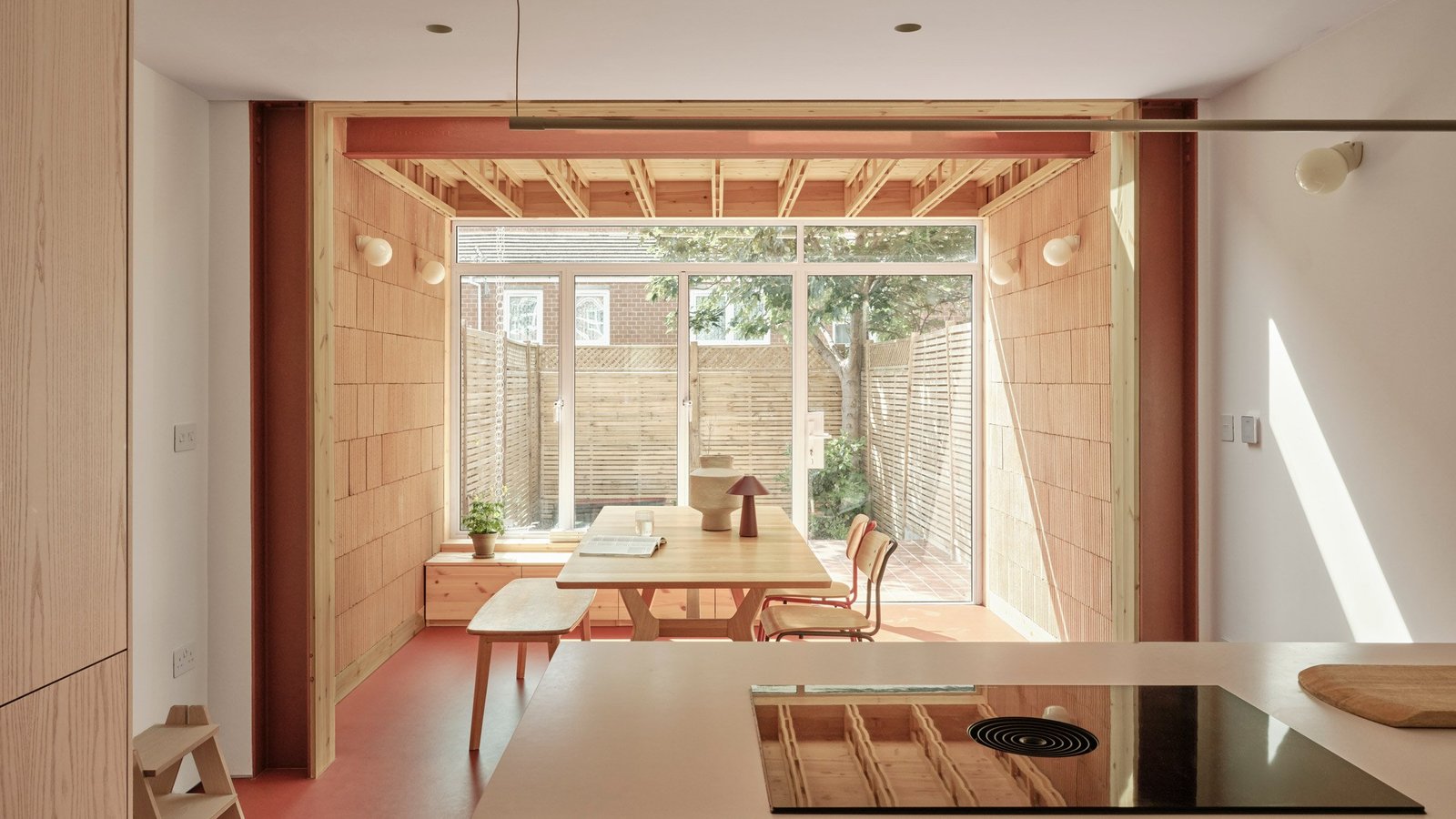 Las paredes de esta ampliación de una casa adosada de posguerra en el norte Londres fueron hechos de entrelazado arcilla bloquea esa firma native Estudio Thiss se deja expuesto para crear un acabado cálido y texturizado.