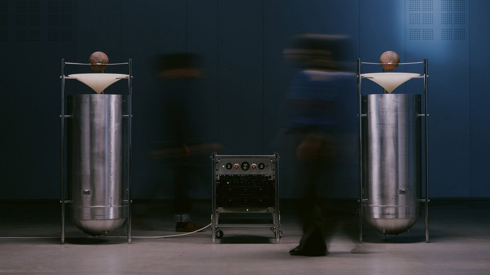 Dos esculturas de steel. altavoces hechos a partir de un tanque de flamable de cohete en desuso para hacer referencia a los escombros «flotando en el espacio exterior» se dieron a conocer en la feria de este año. Diseñoart Tokio.