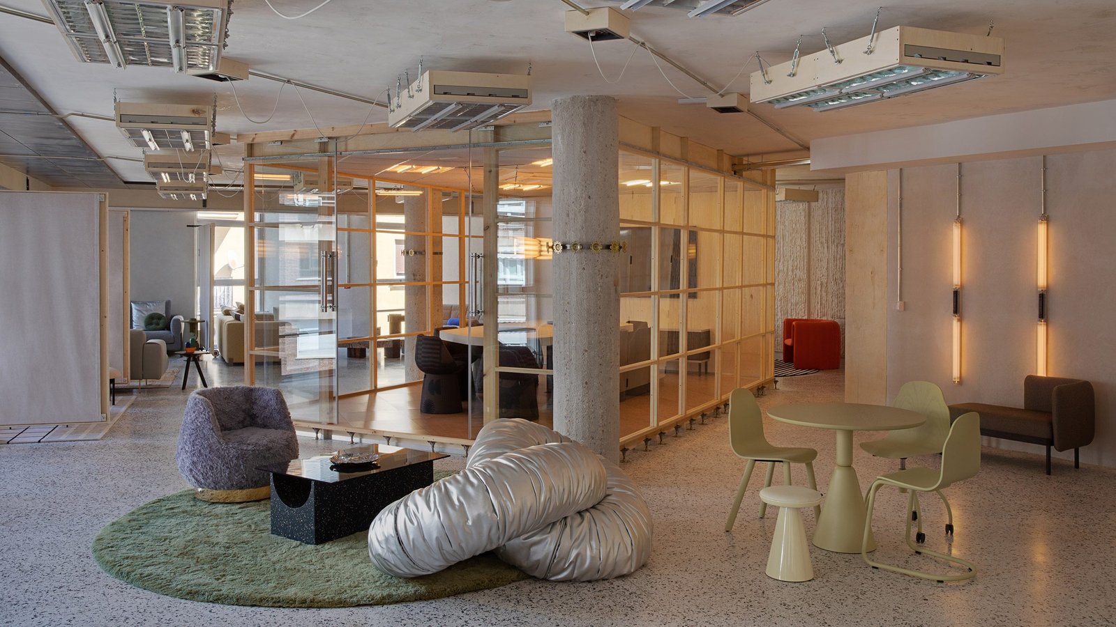 diseñador español Lucas Muñoz ha creado un showroom para la marca de muebles sankal en un antiguo edificio de oficinas en Madridreutilizando todos los materiales del espacio authentic que no se pudieron reciclar.