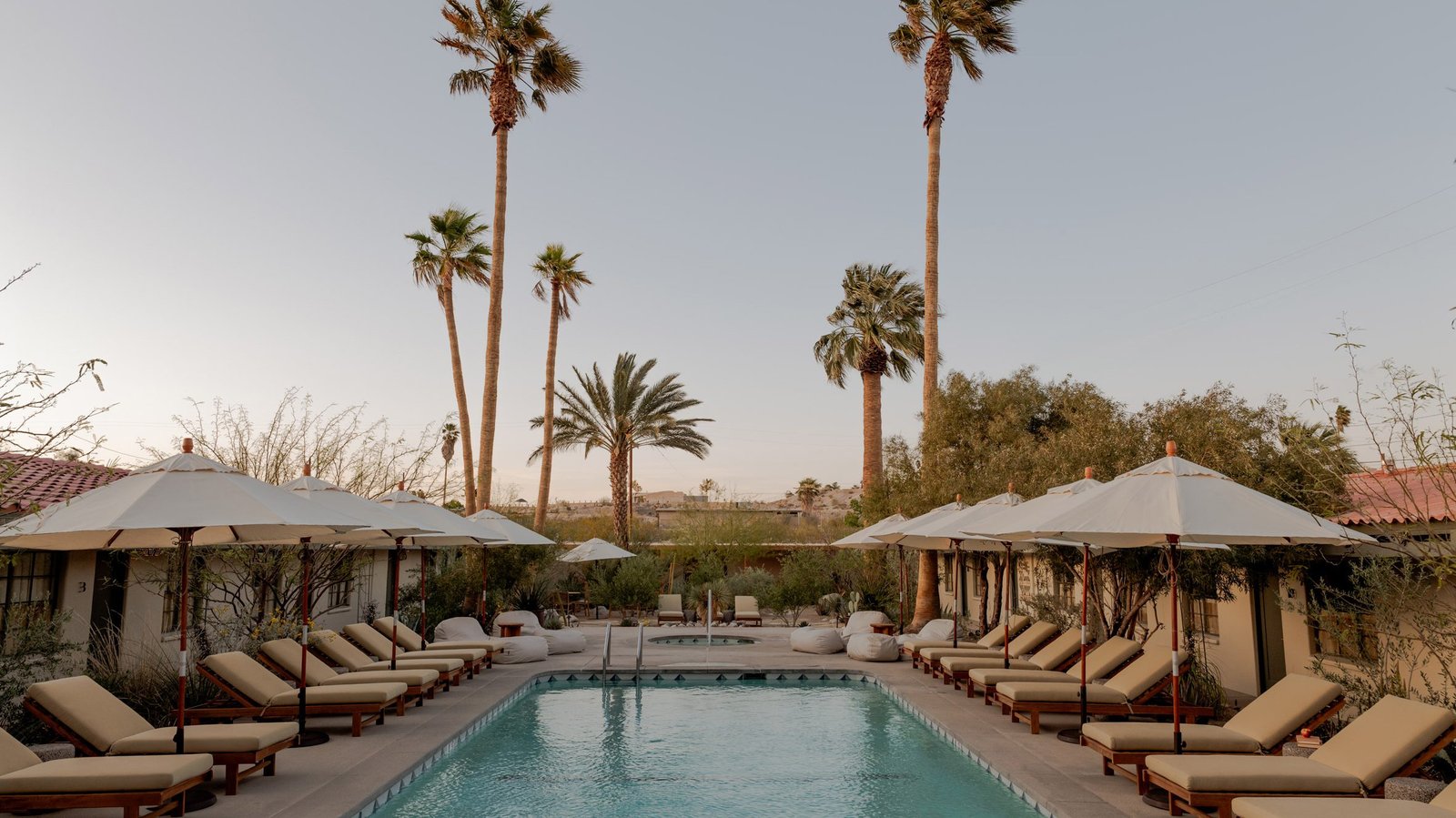 El resort está organizado alrededor de un patio central, donde las tumbonas flanquean una piscina y un jacuzzi, y las mesas y sillas del comedor están rodeadas de flora del desierto.