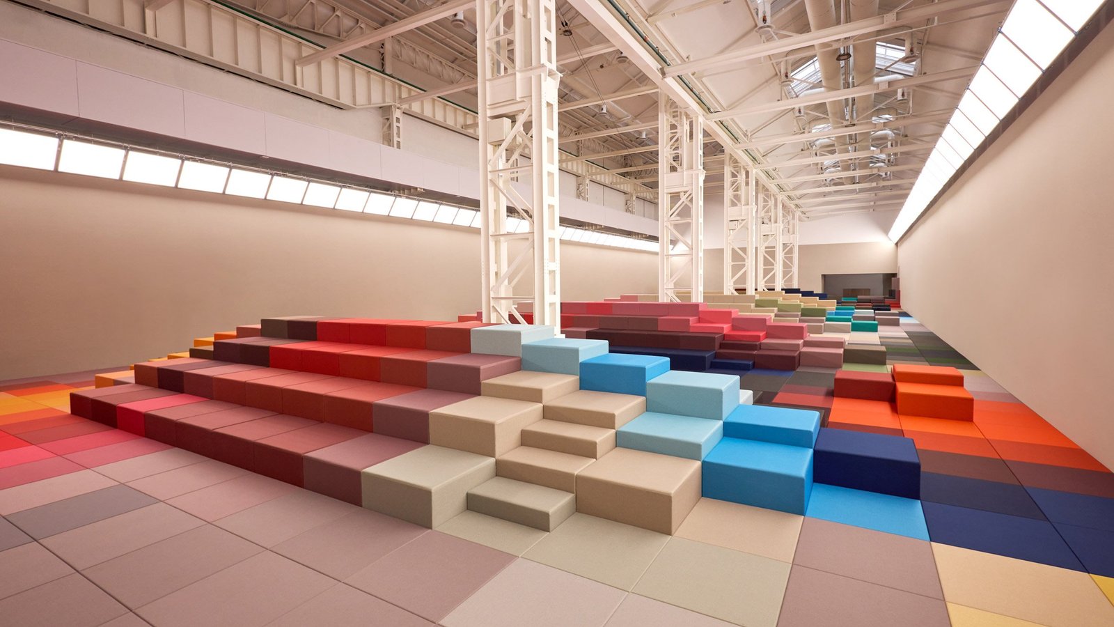 Este patrón floral se magnificó más allá del reconocimiento y se tradujo en un paisaje de píxeles de gran tamaño, que se usa para formar la pista serpentina y los asientos escalonados que se elevan a su alrededor como barras de sonido.