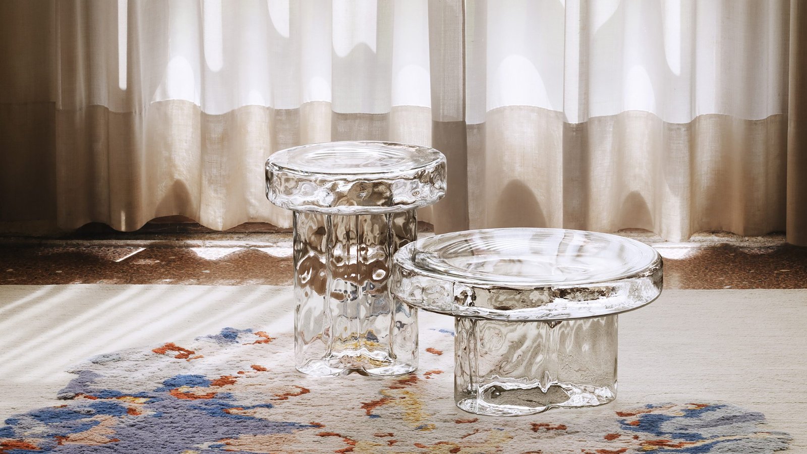 refresco helado es la última variación de colour en el diseño de mesa auxiliar y de centro de vidrio soplado que Ghikas y Miniformas Lanzado por primera vez en 2020, favorece los tonos caramelo intensos como el ámbar y la amatista.