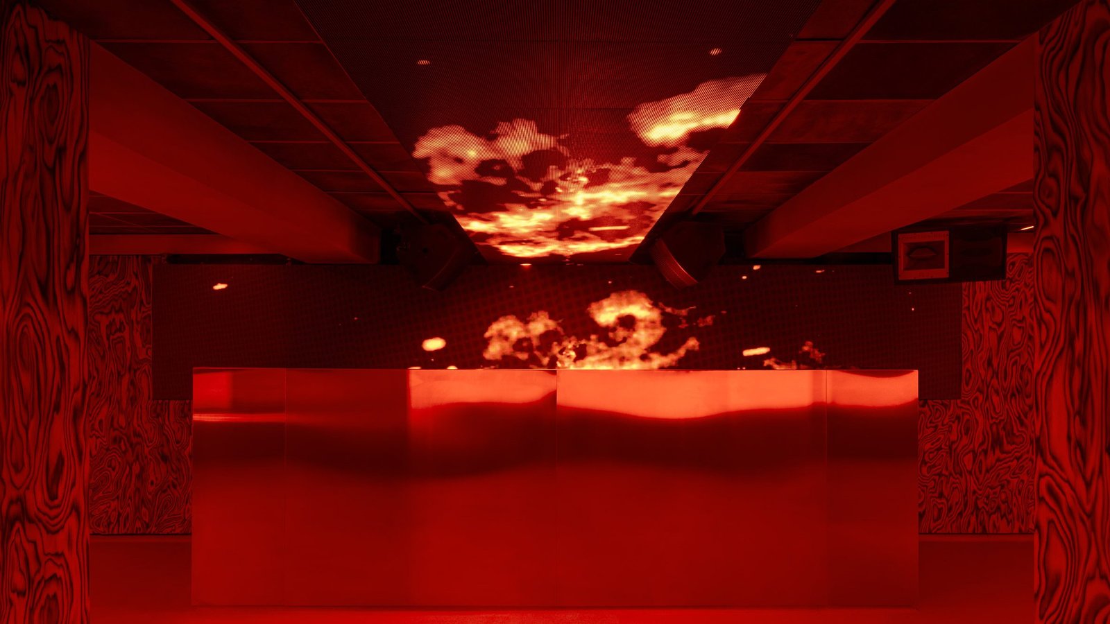 Como su nombre indica, el horno techno en el horno en Valencia fue diseñado para sentirse como un horno, con paredes de madera Alpi rojas y negras con un patrón de burla ondulada que sube por el inside.