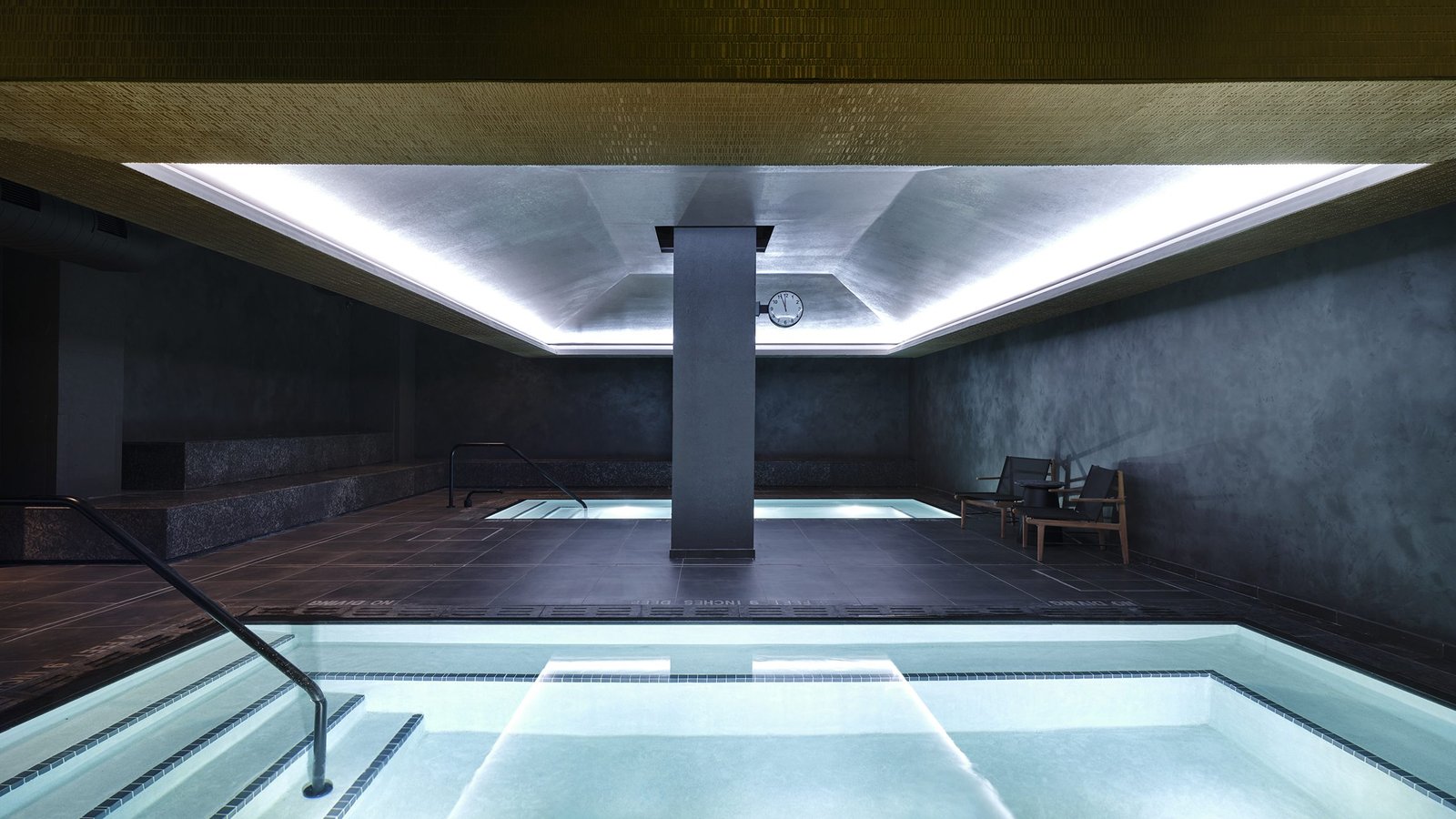 Diseñadas para evocar los restos de una civilización antigua, las pirámides invertidas están suspendidas sobre las piscinas y el travertino estriado envuelve las paredes. Una secuencia de entrada oscura y dramática y áreas cambiantes igualmente atmosféricas evocan una estética más futurista.