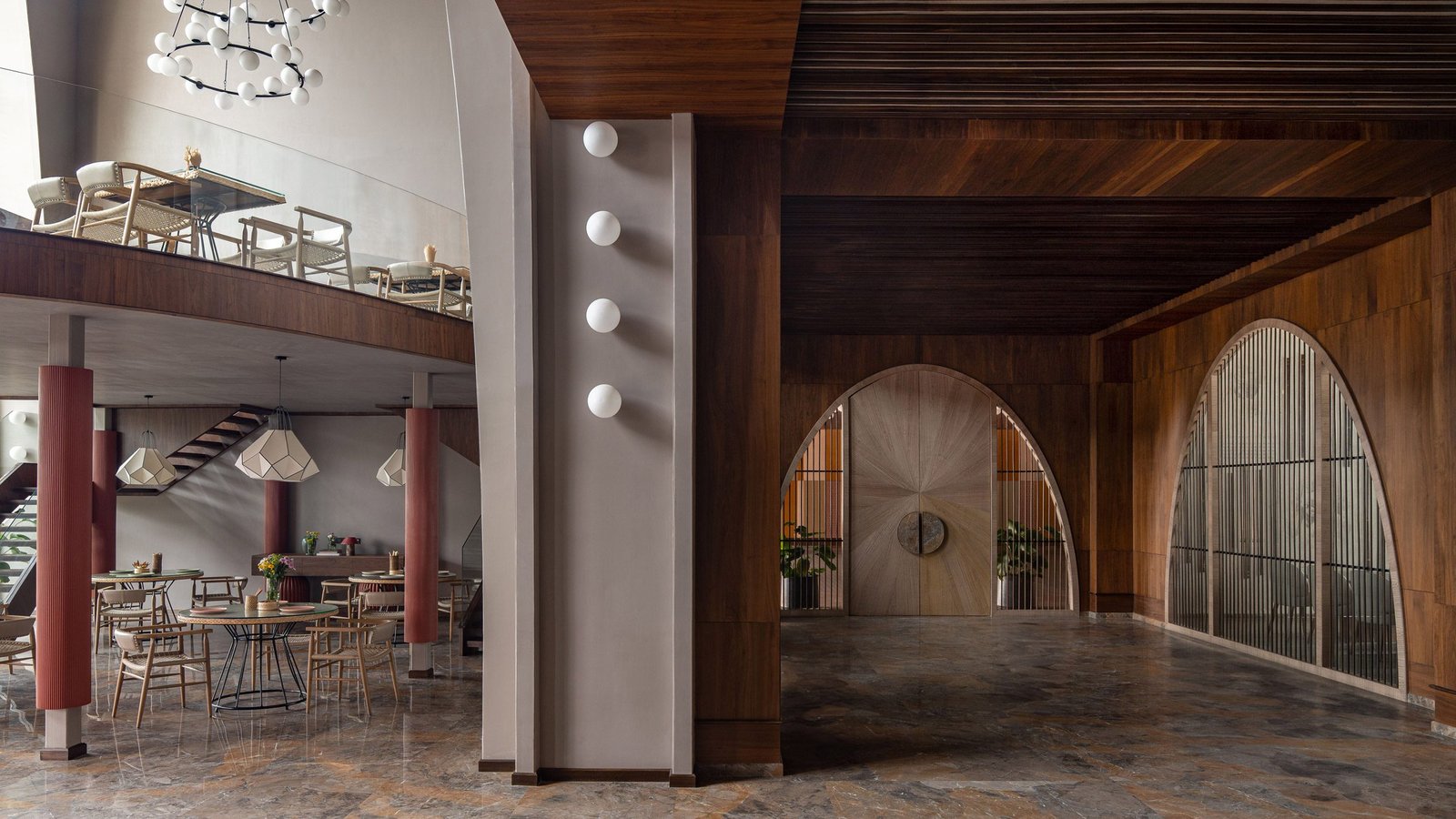 La iluminación escultórica decora el espacio.