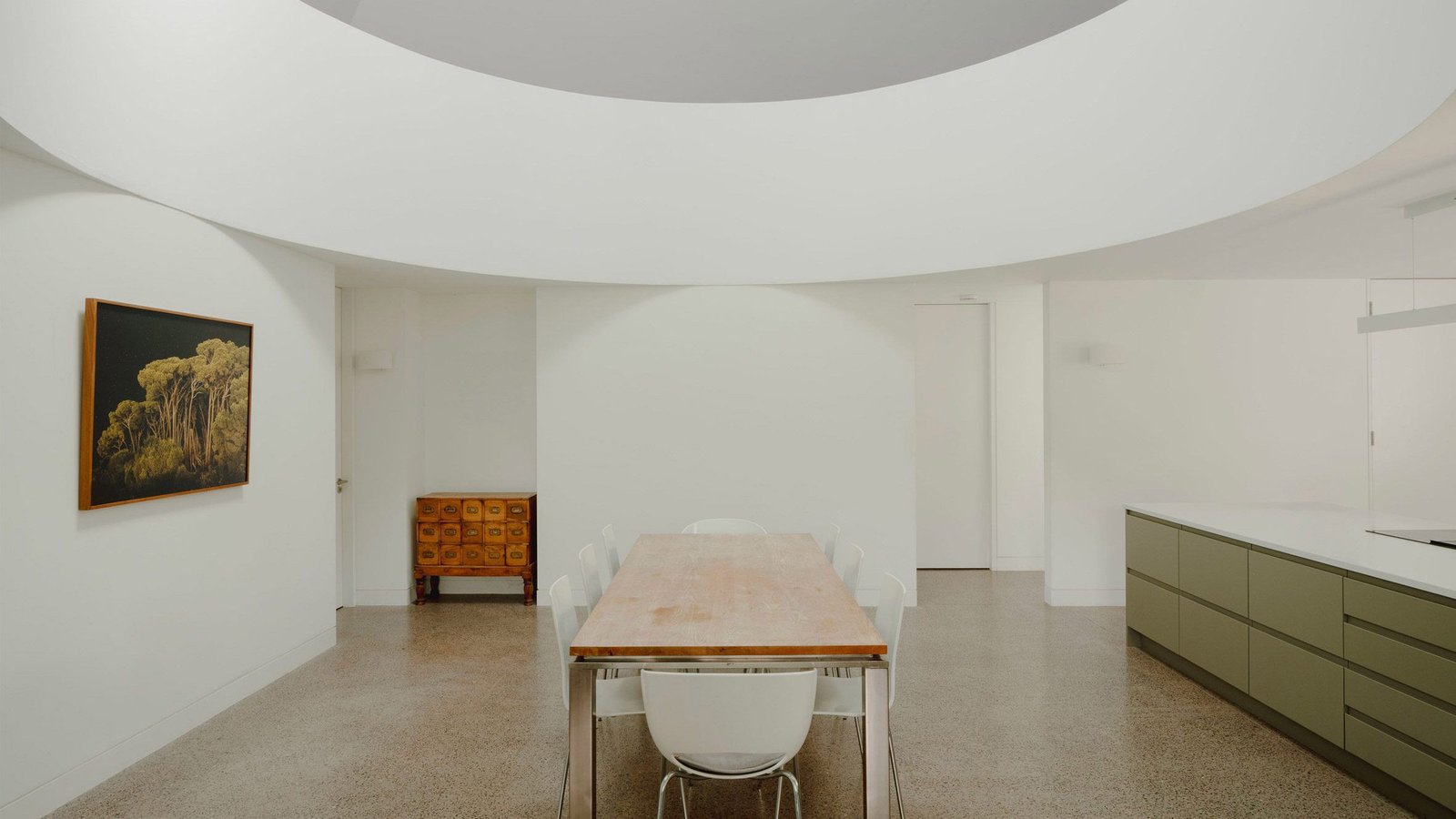 En la planta baja de la casa, una cocina y un comedor de planta abierta reciben luz de un vacío central diseñado por el estudio para actuar como un «corazón luminoso dentro de la casa».