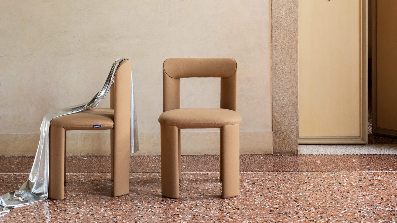 Showroom de Dezeen: Una silueta juguetona se combina con textiles con estampado audaz en este tapizado totalmente tapizado silla de la marca italiana Miniformes y diseño de estudio Huevos.