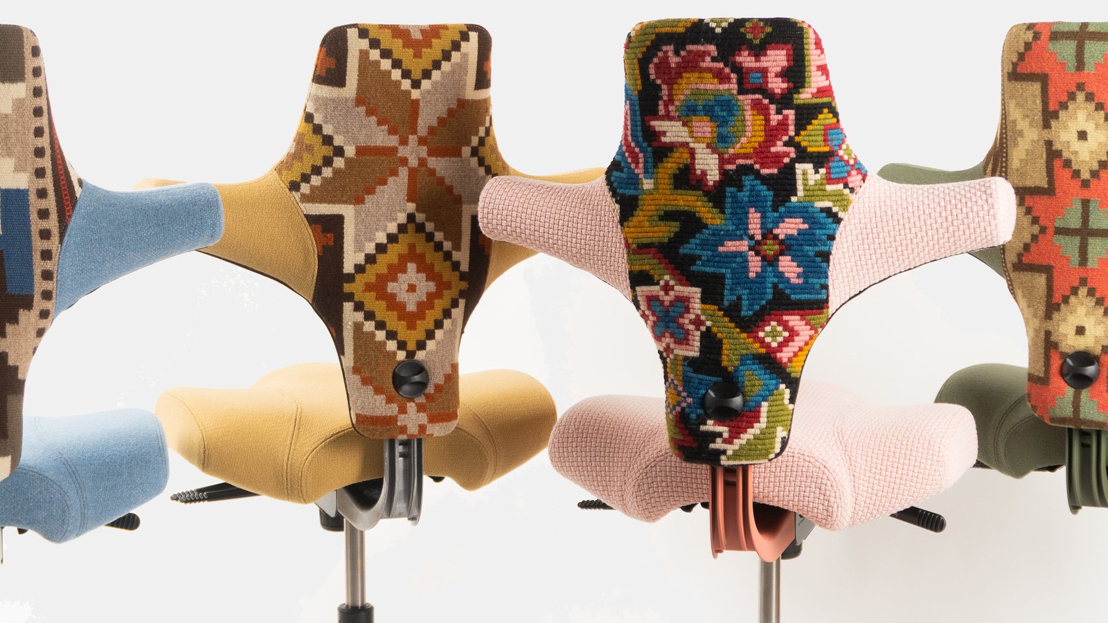 Åkle es un tapiz tradicional tejido a mano de Noruega, y en el Silla operativa HÅG X Recouture Capiscosecciones antiguas están trabajadas en la inconfundible forma ergonómica de la silla Capisco, diseñada originalmente por Peter Opsvik para HÅG y lanzada en 1984.