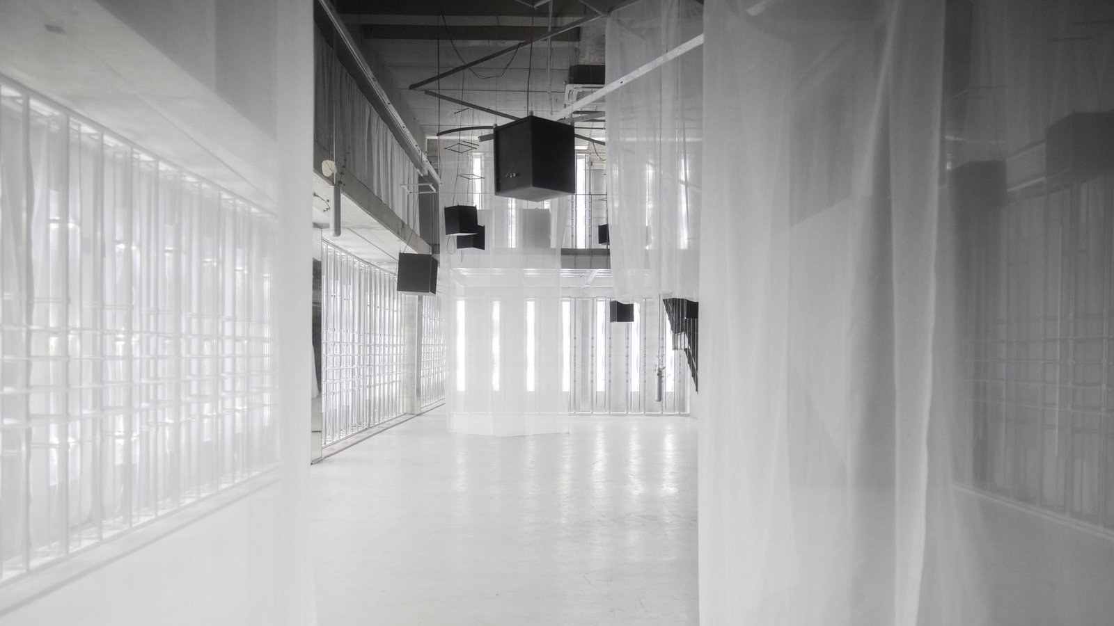 En el centro de la tienda, cortinas blancas translúcidas y altavoces negros cuelgan hacia abajo de una estructura móvil de acero, lo que crea «subdivisiones internas» según el estudio.