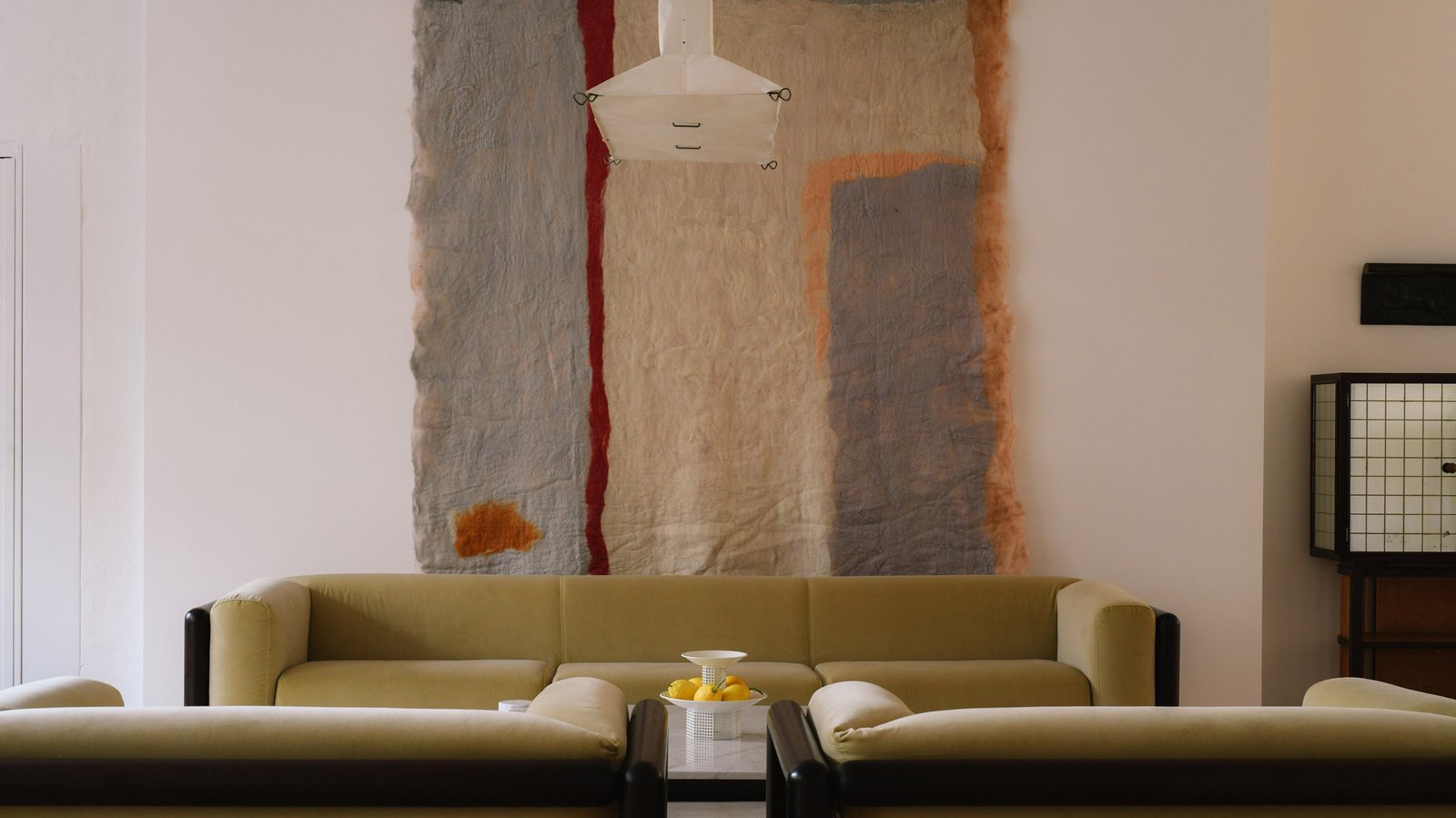 Lámpara escultórica sobre sofá de terciopelo.