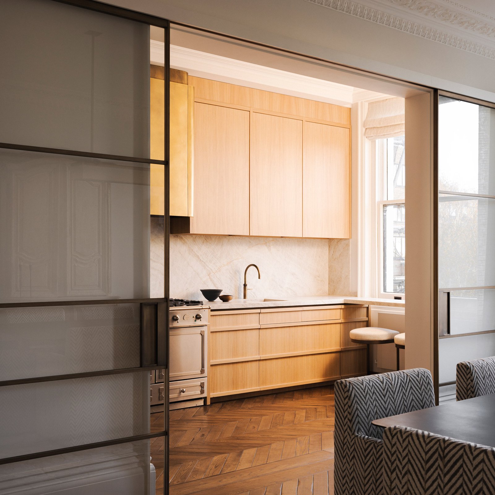 Una tela con diseño de espiga comparable a la que aparece en las sillas del comedor también reviste las puertas del armario del vestidor del cliente.
