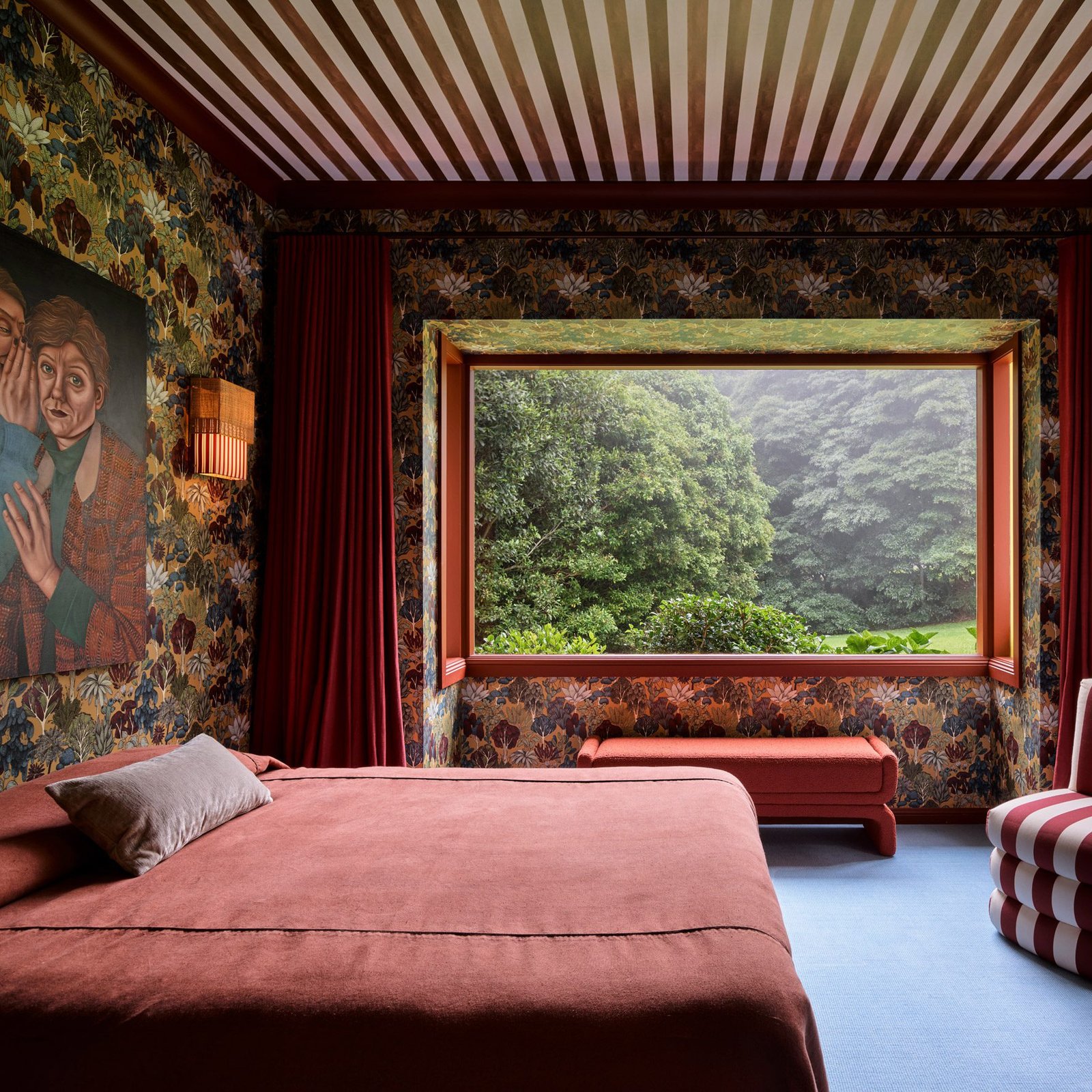 Para suavizar el inside y enfatizar la conexión de la casa de vacaciones con la naturaleza, YSG decoró sus paredes con abundante papel tapiz con motivos de flora y fauna.